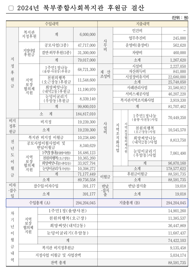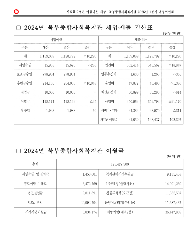 [공시]2024년도 북부종합사회복지관 세입세출결산 및 후원금 결산 페이지 정보 작성자 작성자 관리자 작성일작성일 2025.03.28 조회조회 122 본문 첨부파일 [공시]2024년도 북부종합사회복지관 세입세출결산 및 후원금 결산 이전글북부종합사회복지관 운영법인 변경 안내(2025.4.1일자) 다음글2025년 북부종합사회복지관 예산 공시 목록 댓글목록 0 댓글목록 등록된 댓글이 없습니다.