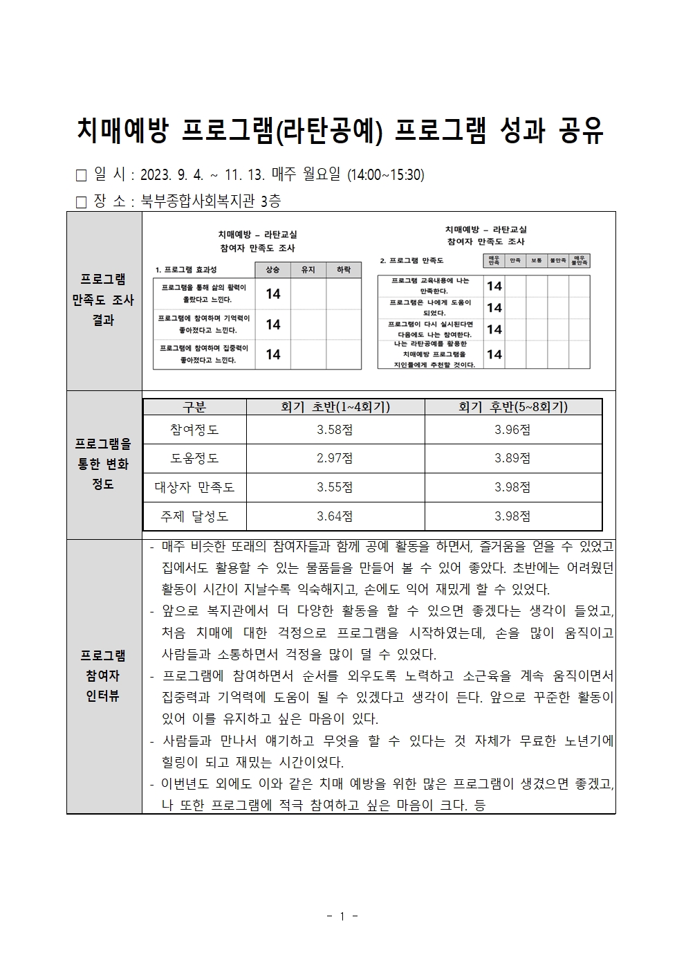 2023년 치매예방 프로그램(라탄공예) 프로그램 성과 공유 페이지 정보 작성자 작성자 관리자 작성일작성일 2023.11.15 조회조회 91 본문 첨부파일 2023년 치매예방 프로그램(라탄공예) 프로그램 성과 공유 이전글2023년 중장년 갱년기 예방을 위한 꽃중년 갱년기 극복 프로그램 성과 공유 다음글북부종합사회복지관 2022년 운영위원회 회의결과 공개 목록 댓글목록 0 댓글목록 등록된 댓글이 없습니다.