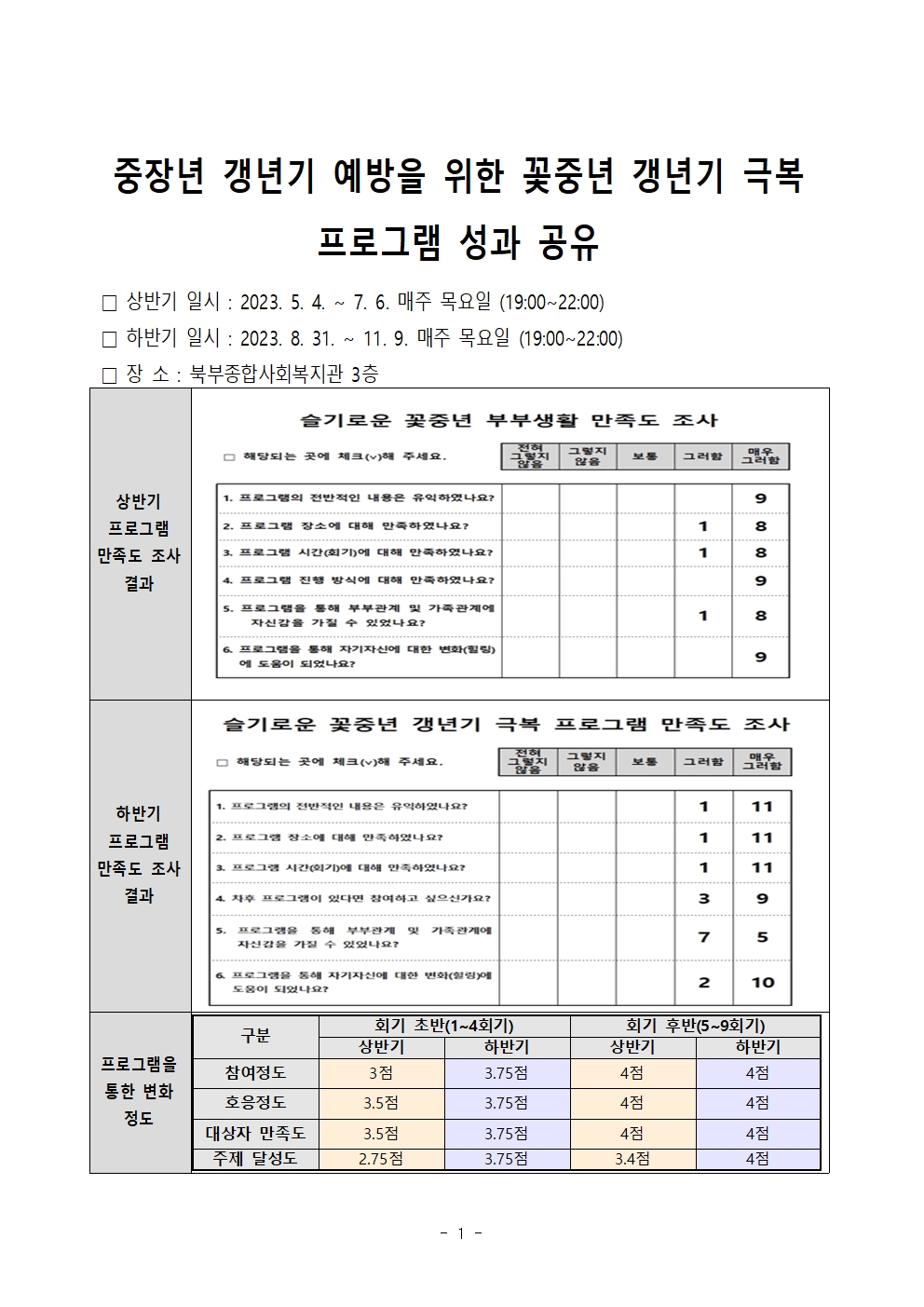 2023년 중장년 갱년기 예방을 위한 꽃중년 갱년기 극복 프로그램 성과 공유 페이지 정보 작성자 작성자 관리자 작성일작성일 2023.11.10 조회조회 98 본문 첨부파일 2023년 중장년 갱년기 예방을 위한 꽃중년 갱년기 극복 프로그램 성과 공유 이전글디지털 교실 수강생 모집 다음글2023년 치매예방 프로그램(라탄공예) 프로그램 성과 공유 목록 댓글목록 0 댓글목록 등록된 댓글이 없습니다.