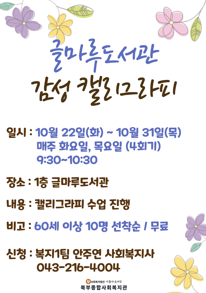 글마루도서관 감성 캘리그라피 참여자 모집 페이지 정보 작성자 작성자 관리자 작성일작성일 2024.09.10 조회조회 205 본문 첨부파일 북부종합사회복지관 글마루도서관 프로그램 참여자 모집합니다!많은 참여 부탁드립니다. 이전글(게시글 필독!) 2025년 아동방학교실(동계) 신청 안내 다음글2024년 은빛문화센터 하반기 참여자 모집 목록 댓글목록 0 댓글목록 등록된 댓글이 없습니다.