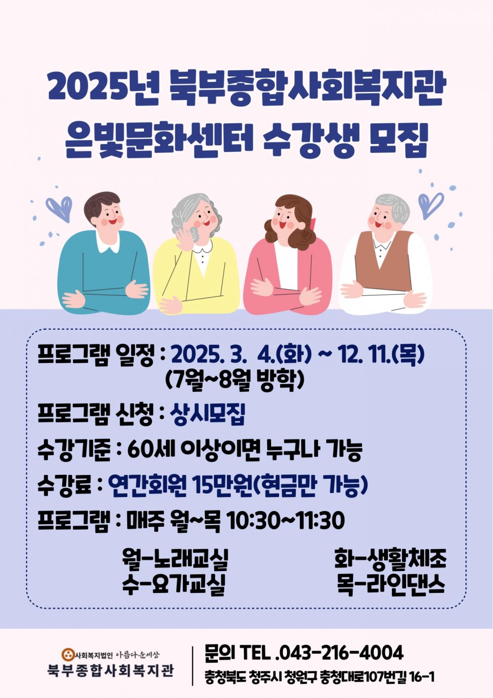 2025년 은빛문화센터 참여자 모집 페이지 정보 작성자 작성자 관리자 작성일작성일 2025.01.16 조회조회 21,783 본문 첨부파일 2025년 은빛문화센터 참여자 모집 이전글2025년 디지털배움터 금융교육 참여자 모집 다음글'아름드리 자원봉사단' 발대식 개최 보도자료 목록 댓글목록 0 댓글목록 등록된 댓글이 없습니다.