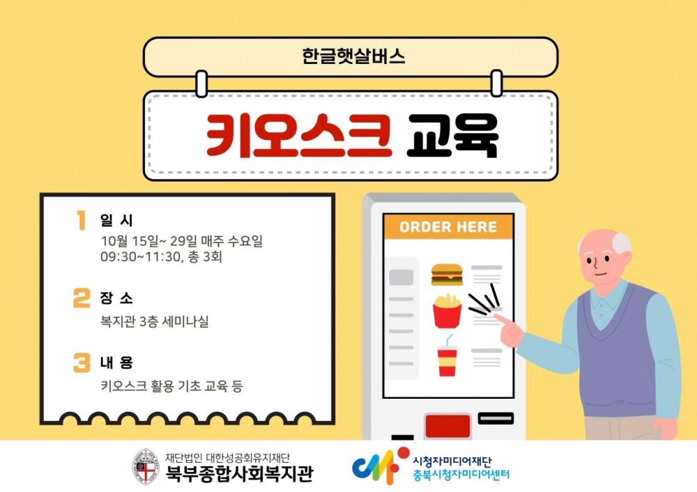 북부종합사회복지관에서는 충북시청자미디어센터와 함께 키오스크 기초 활용법 교육인 [한글햇살버스]를 운영합니다.
