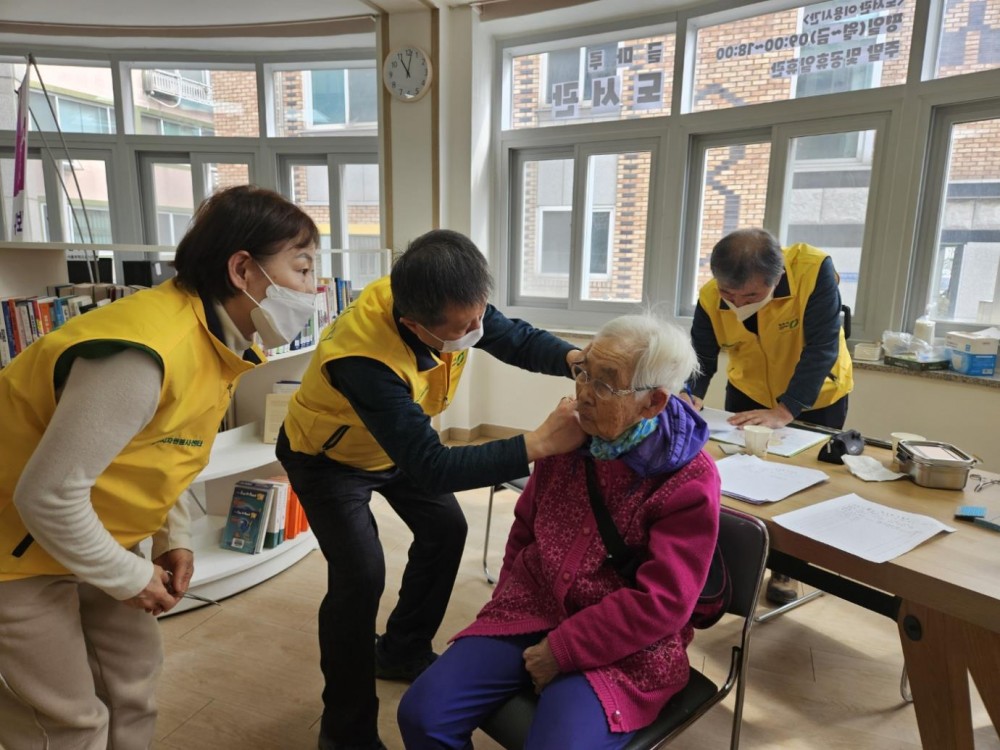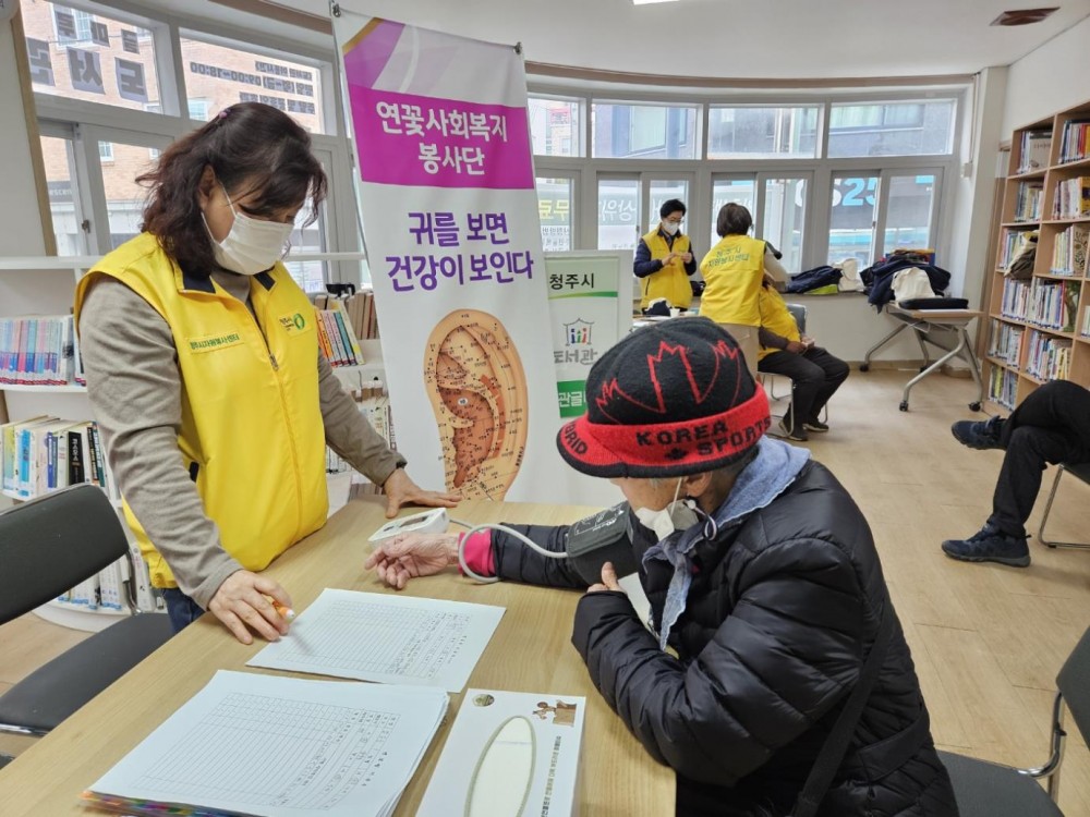 이혈봉사는 혈압 측정을 하고, 귀를 통해 건강을 확인하여 간단한 상담과 패치 부착을 진행합니다.