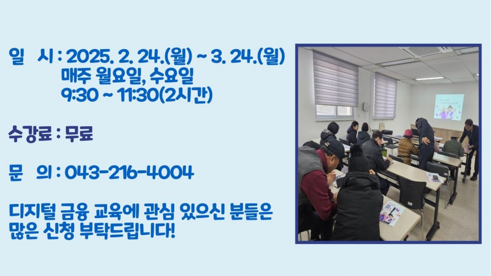 2025년 디지털배움터 금융교육 진행 페이지 정보 작성자 작성자 관리자 작성일작성일 2025.02.24 조회조회 68 본문 2025년 디지털배움터 금융교육 진행 이전글2025년 문해교육 한문교실 진행 다음글2025년 이혈서비스 진행 목록