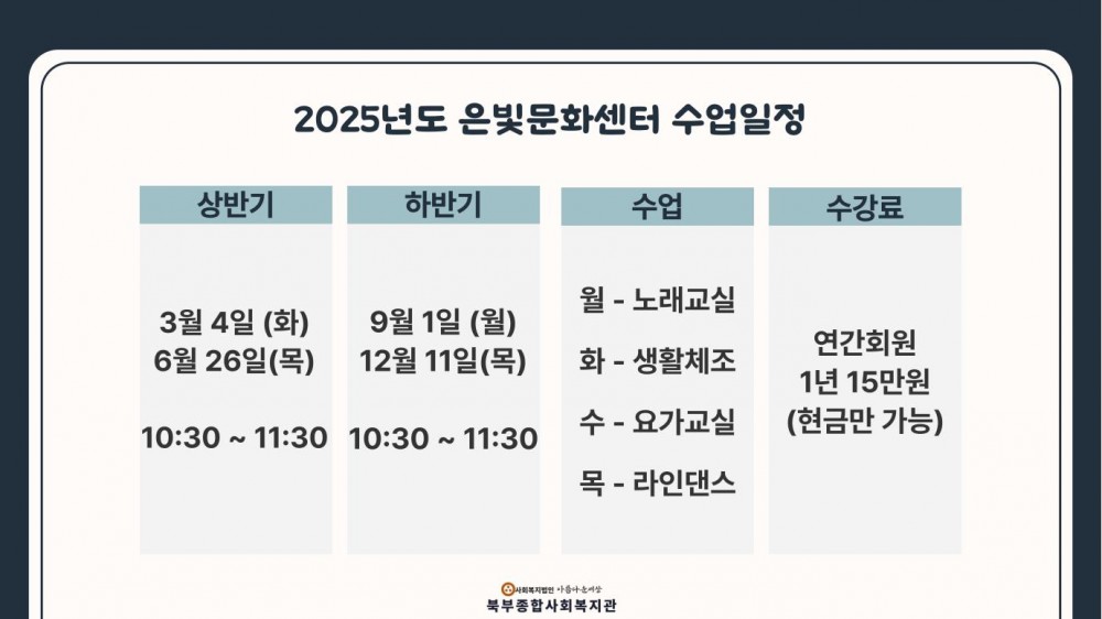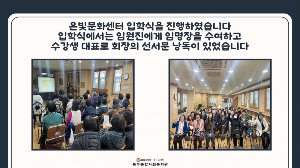 2025년 은빛문화센터 입학식 진행 페이지 정보 작성자 작성자 관리자 작성일작성일 2025.03.04 조회조회 92 본문 2025년 은빛문화센터 입학식 진행 이전글2025년 문해교육 한글교실 진행 다음글2025년 2월 면사랑데이 목록
