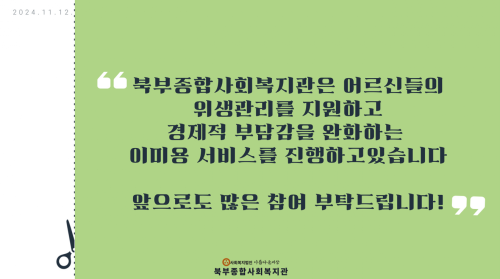 미용 서비스 5회기 실시 페이지 정보 작성자 작성자 관리자 작성일작성일 2024.11.12 조회조회 78 본문 미용 서비스 5회기 실시 이전글한글문해교실 종강 다음글2024. 환경미화활동 목록