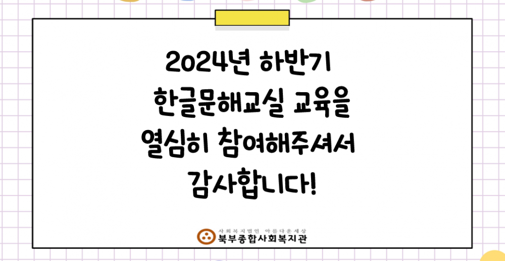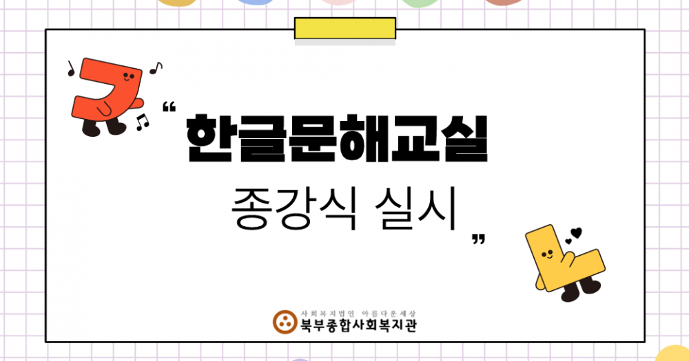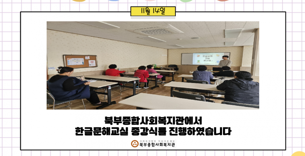한글문해교실 종강 페이지 정보 작성자 작성자 관리자 작성일작성일 2024.11.14 조회조회 87 본문 한글문해교실 종강 이전글2024. 한국병원 건강강좌 다음글미용 서비스 5회기 실시 목록