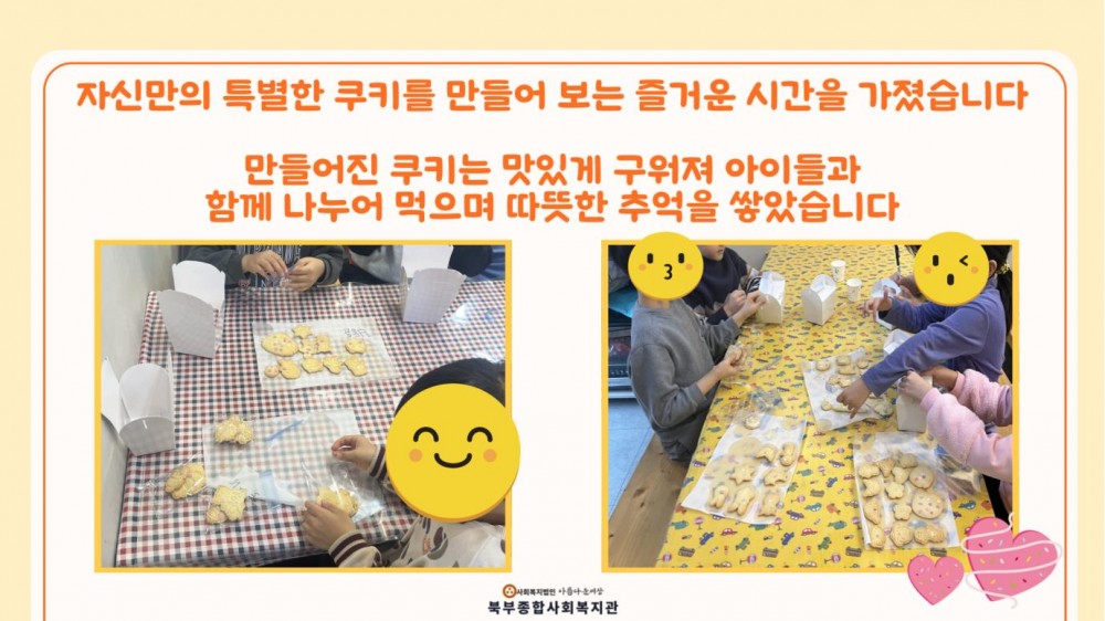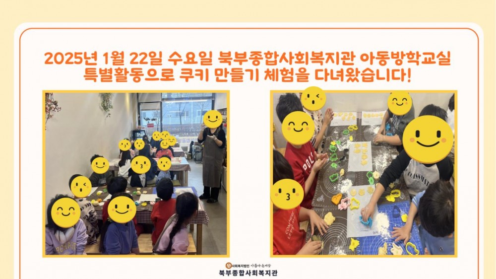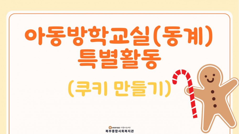 2025년 아동방학교실(동계) 특별활동 (쿠키 만들기) 페이지 정보 작성자 작성자 관리자 작성일작성일 2025.01.22 조회조회 87 본문 2025년 아동방학교실(동계) 특별활동 (쿠키 만들기) 이전글중소기업사랑나눔재단 설맞이 특식 나눔 봉사활동 다음글청주미용학원 · 착한미용실 업무협약식 목록