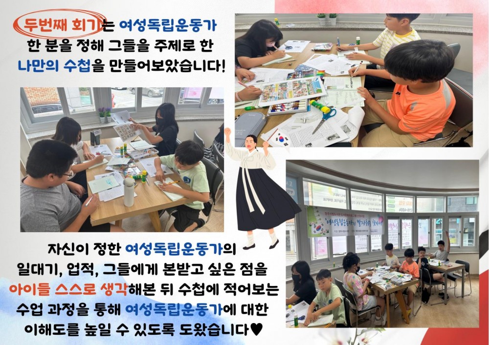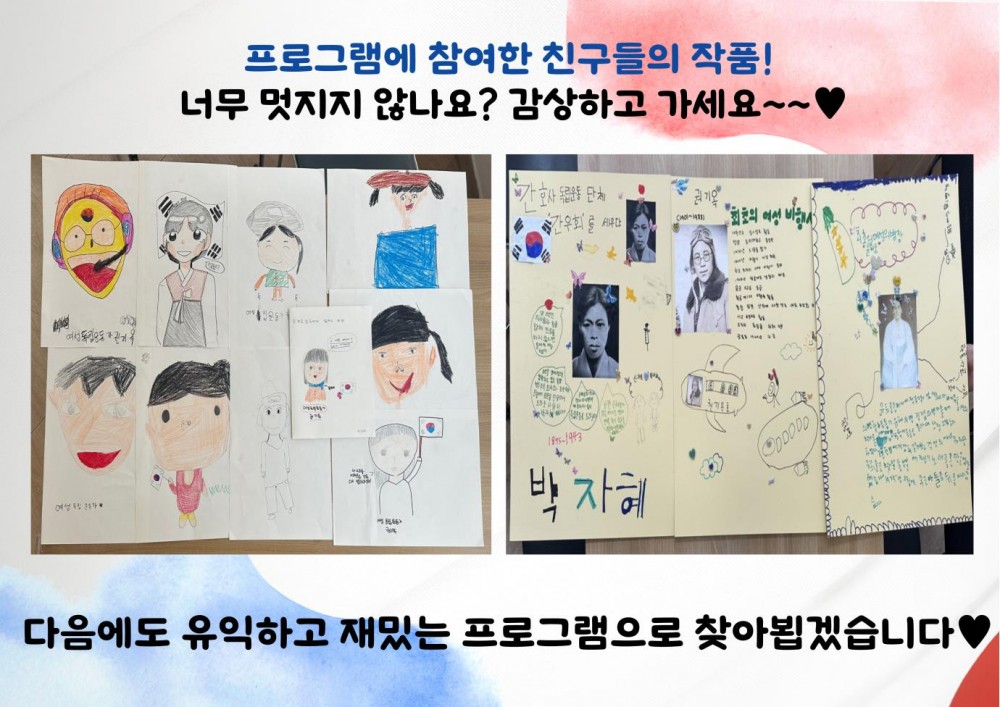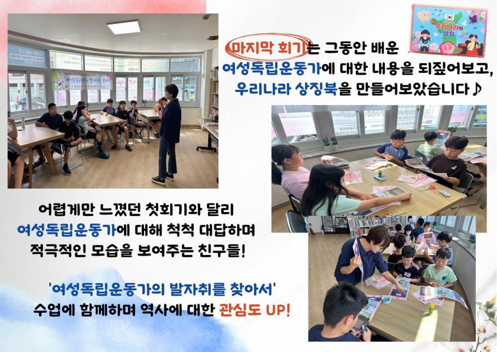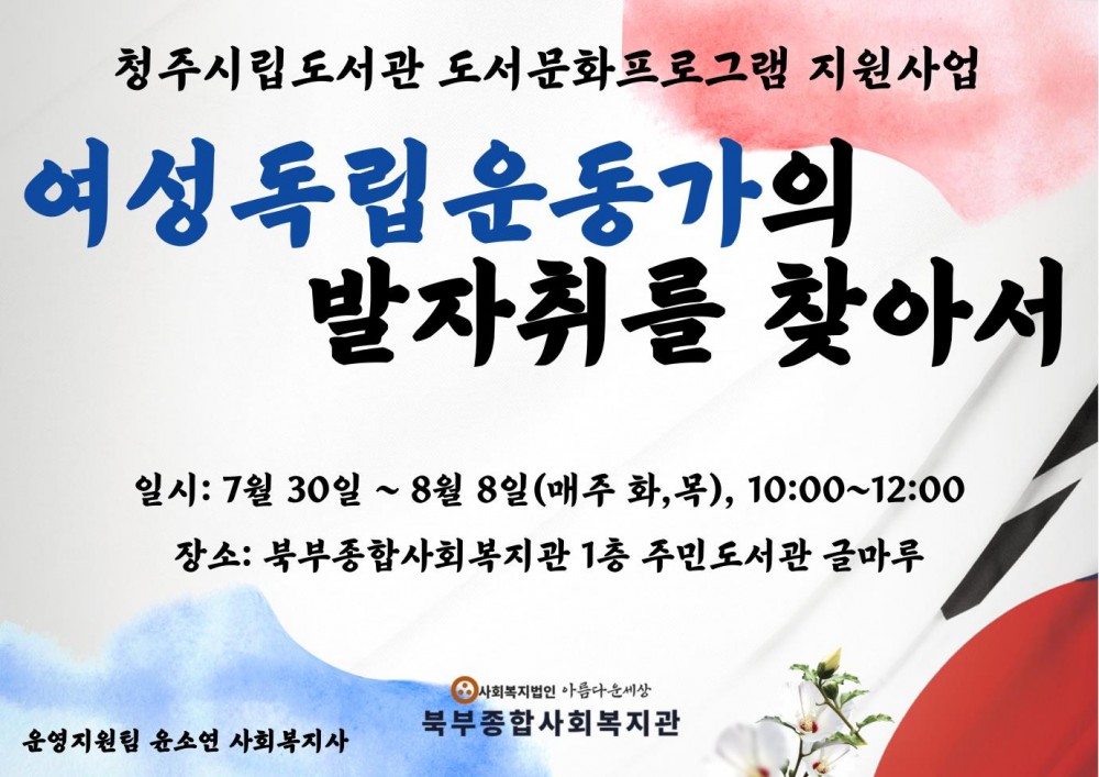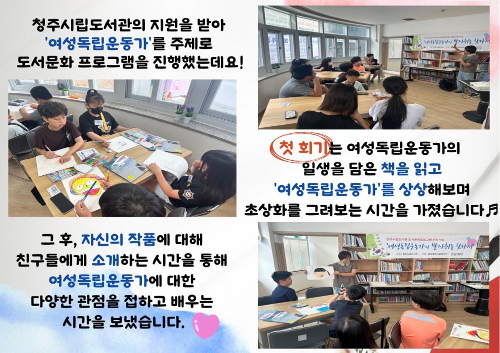 2024년 청주시립도서관 지원 사업 '여성독립운동가의 발자취를 찾아서' 페이지 정보 작성자 작성자 관리자 작성일작성일 2024.08.09 조회조회 83 본문 2024년 청주시립도서관 지원 사업 '여성독립운동가의 발자취를 찾아서' 이전글2024년 7월 면사랑DAY 다음글2024년 청주시립도서관 지원 사업 '나라사랑 국경일(광복절)' 목록