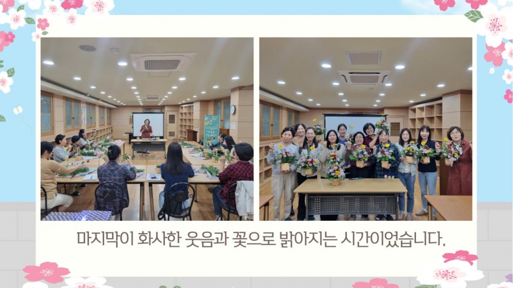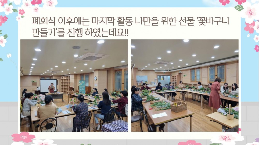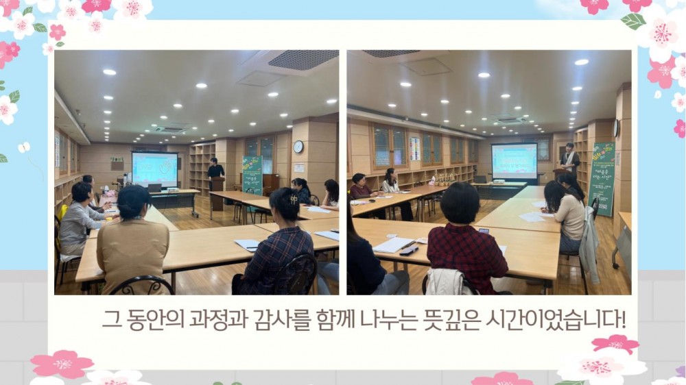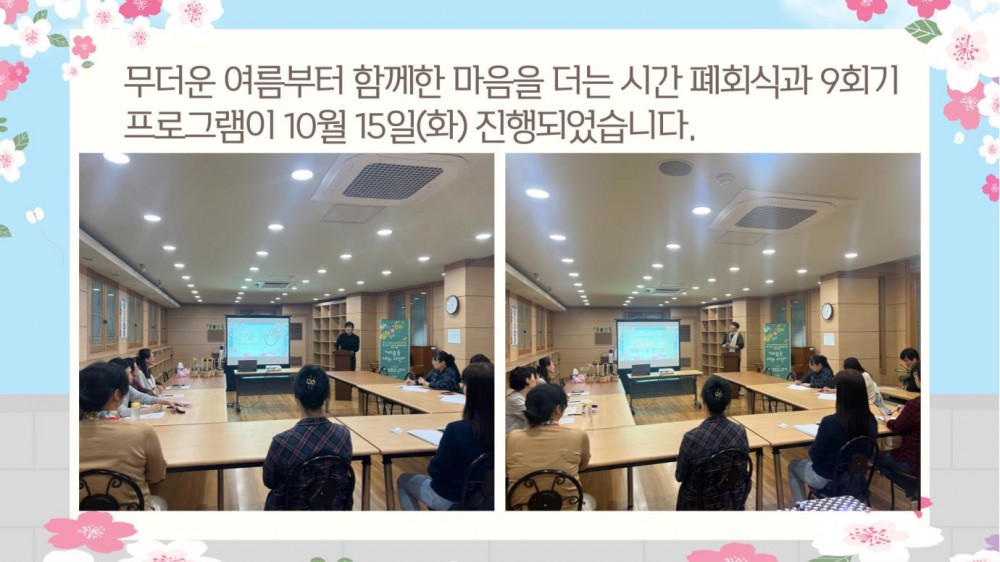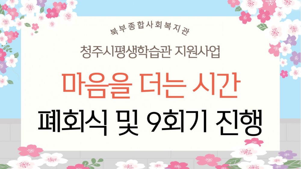청주시 평생학습관 지원사업 <마음을 더는 시간> 폐회식 및 9회기 진행 페이지 정보 작성자 작성자 관리자 작성일작성일 2024.10.16 조회조회 78 본문 청주시 평생학습관 지원사업 <마음을 더는 시간> 폐회식 및 9회기 진행 이전글10월 생신잔치 다음글2024 충북사회복지관의날 기념행사 목록