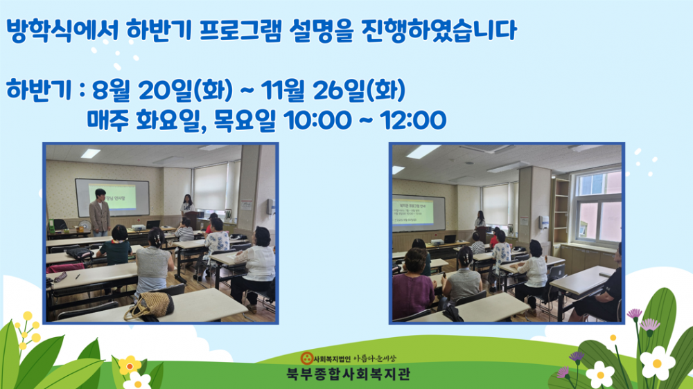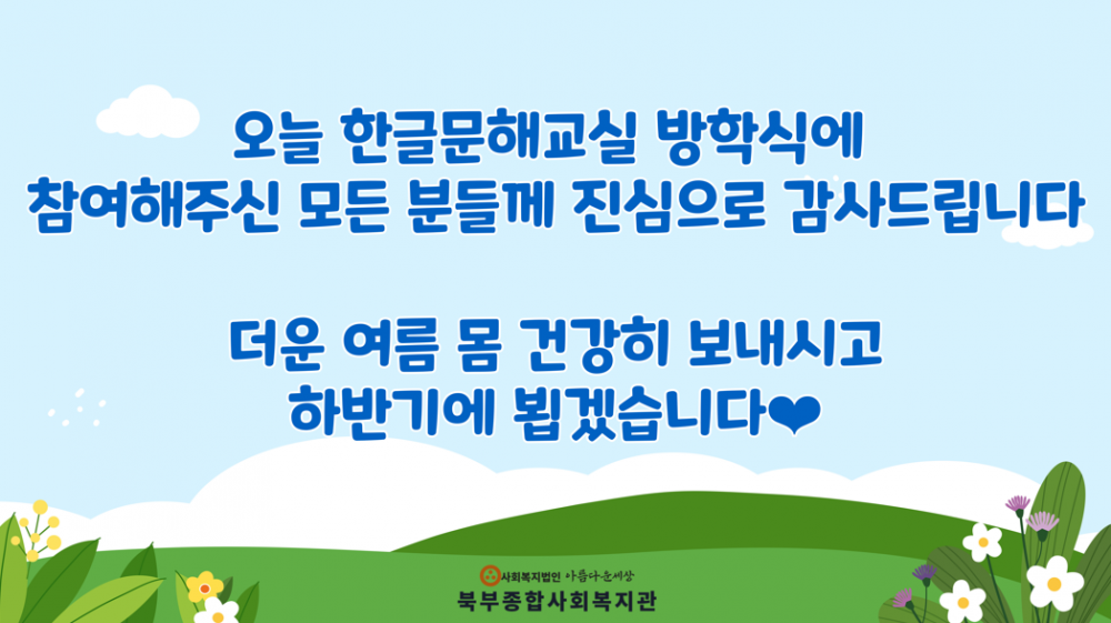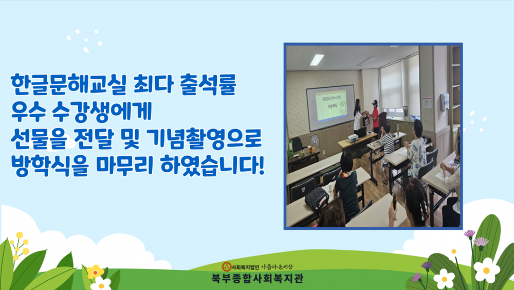 한글문해교실 방학식 페이지 정보 작성자 작성자 관리자 작성일작성일 2024.07.25 조회조회 114 본문 한글문해교실 방학식 이전글2024 청소년자원봉사학교 다음글무더위쉼터 기획프로그램 실시 목록