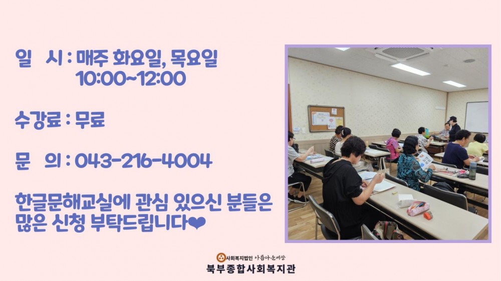 2024년 평생학습 하반기 한글교실 진행 페이지 정보 작성자 작성자 관리자 작성일작성일 2024.08.20 조회조회 70 본문 2024년 평생학습 하반기 한글교실 진행 이전글8월 행복꽃이 피었습니다♥ (with LG에너지솔루션) 다음글2024년 디지털배움터 스마트폰교 목록