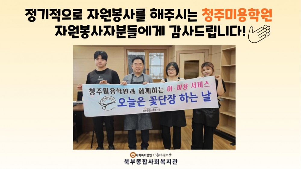 2024년 이미용 서비스 3회기 실시 페이지 정보 작성자 작성자 관리자 작성일작성일 -0001.11.30 조회조회 90 본문 2024년 이미용 서비스 3회기 실시 이전글2024년 제20기 보리수 은빛문화센터 방학식 다음글2024년 6월 면사랑DAY 목록