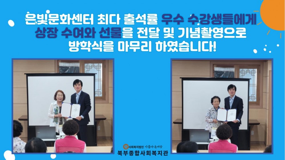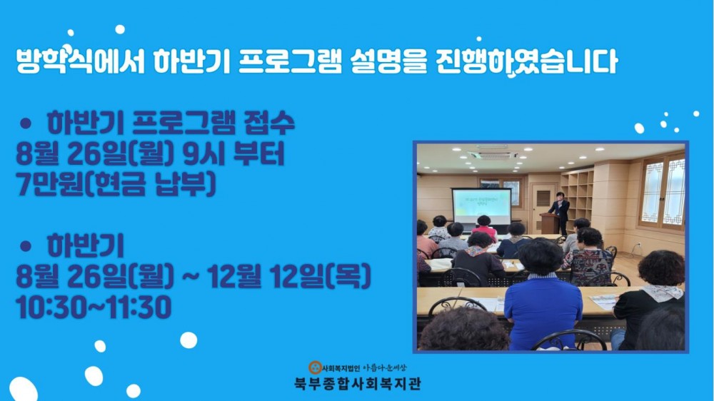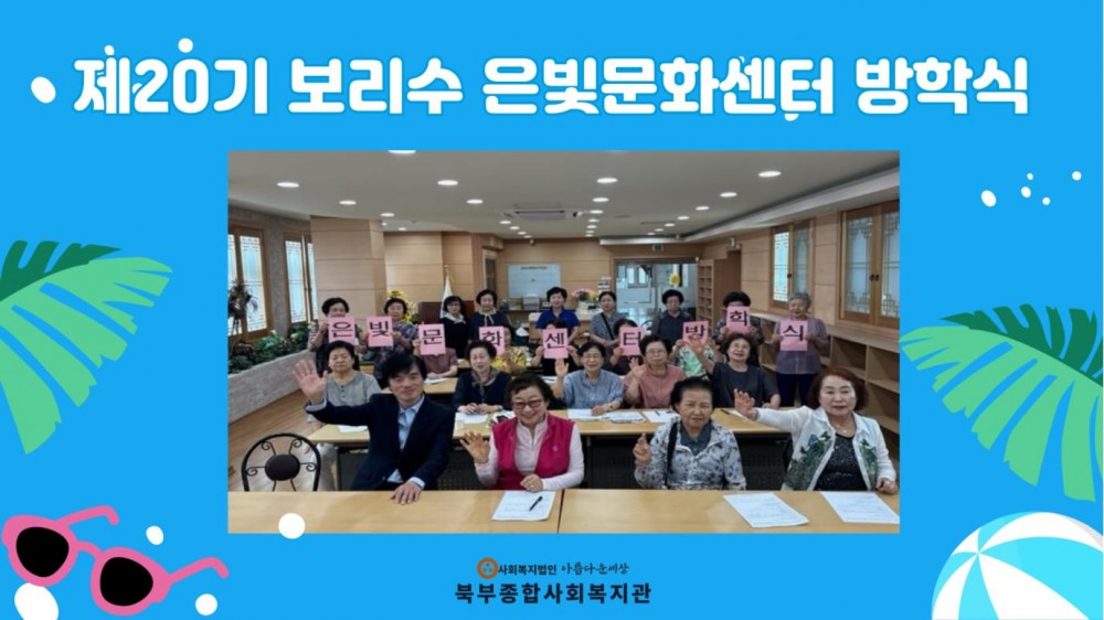 2024년 제20기 보리수 은빛문화센터 방학식 페이지 정보 작성자 작성자 관리자 작성일작성일 2024.06.27 조회조회 129 본문 2024년 제20기 보리수 은빛문화센터 방학식 이전글2024년 '더 우아한 시니어의 일품 요리 교실' 6회기 진행(수육&얼갈이겉절이) 다음글2024년 이미용 서비스 3회기 실시 목록
