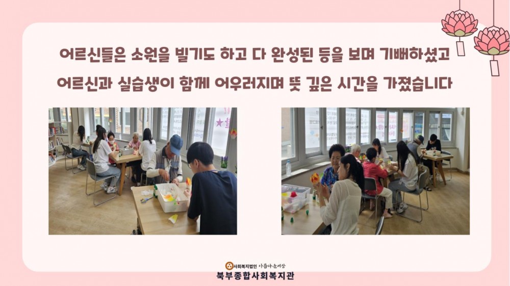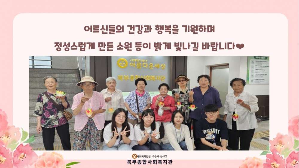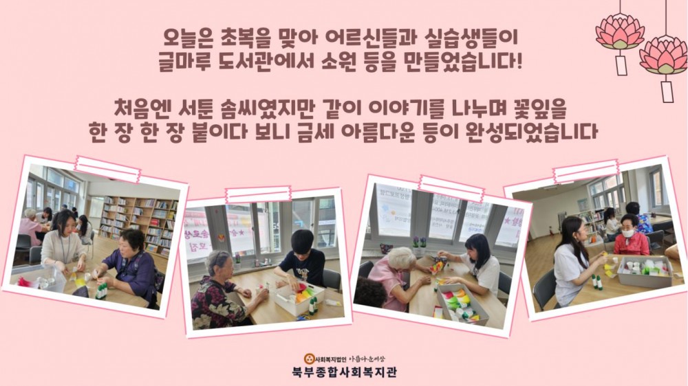 초복맞이 소원 등 만들기 페이지 정보 작성자 작성자 관리자 작성일작성일 2024.07.15 조회조회 128 본문 초복맞이 소원 등 만들기 이전글무더위쉼터 기획프로그램 실시 다음글2024년 '더 우아한 시니어의 일품 요리 교실' 7회기 진행(지역사회 나들이) 목록